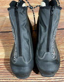 Boots are the most obviously distinctive family of Nordic ski boots. They have a 75mm wide "duck bill" at the front of the boot, with three holes on the bottom of the bill that line up with the pins on their appropriate binding.