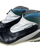 Boots are the most obviously distinctive family of nordic ski boots. They have a 75mm wide "duck bill" at the front of the boot, with three holes on the bottom of the bill that line up with the pins on their appropriate binding.