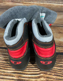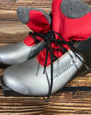 Boots are the most obviously distinctive family of Nordic ski boots. They have a 75mm wide "duck bill" at the front of the boot, with three holes on the bottom of the bill that line up with the pins on their appropriate binding.