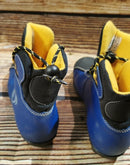 Boots are the most obviously distinctive family of nordic ski boots. They have a 75mm wide "duck bill" at the front of the boot, with three holes on the bottom of the bill that line up with the pins on their appropriate binding.