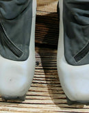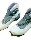 Boots are the most obviously distinctive family of nordic ski boots. They have a 75mm wide "duck bill" at the front of the boot, with three holes on the bottom of the bill that line up with the pins on their appropriate binding.