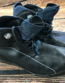 Boots are the most obviously distinctive family of nordic ski boots. They have a 75mm wide "duck bill" at the front of the boot, with three holes on the bottom of the bill that line up with the pins on their appropriate binding.