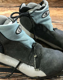 Boots are the most obviously distinctive family of nordic ski boots. They have a 75mm wide "duck bill" at the front of the boot, with three holes on the bottom of the bill that line up with the pins on their appropriate binding.