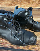 Boots are the most obviously distinctive family of Nordic ski boots. They have a 75mm wide "duck bill" at the front of the boot, with three holes on the bottom of the bill that line up with the pins on their appropriate binding.
