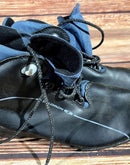 Boots are the most obviously distinctive family of nordic ski boots. They have a 75mm wide "duck bill" at the front of the boot, with three holes on the bottom of the bill that line up with the pins on their appropriate binding.