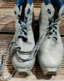 Boots are the most obviously distinctive family of nordic ski boots. They have a 75mm wide "duck bill" at the front of the boot, with three holes on the bottom of the bill that line up with the pins on their appropriate binding.