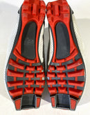 Boots are the most obviously distinctive family of nordic ski boots. They have a 75mm wide "duck bill" at the front of the boot, with three holes on the bottom of the bill that line up with the pins on their appropriate binding.