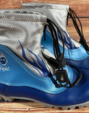 Boots are the most obviously distinctive family of nordic ski boots. They have a 75mm wide "duck bill" at the front of the boot, with three holes on the bottom of the bill that line up with the pins on their appropriate binding.