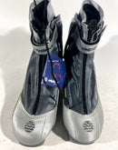 Boots are the most obviously distinctive family of nordic ski boots. They have a 75mm wide "duck bill" at the front of the boot, with three holes on the bottom of the bill that line up with the pins on their appropriate binding.