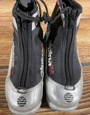 Boots are the most obviously distinctive family of nordic ski boots. They have a 75mm wide "duck bill" at the front of the boot, with three holes on the bottom of the bill that line up with the pins on their appropriate binding.