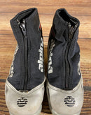 Boots are the most obviously distinctive family of nordic ski boots. They have a 75mm wide "duck bill" at the front of the boot, with three holes on the bottom of the bill that line up with the pins on their appropriate binding.
