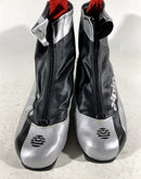 Boots are the most obviously distinctive family of nordic ski boots. They have a 75mm wide "duck bill" at the front of the boot, with three holes on the bottom of the bill that line up with the pins on their appropriate binding.
