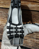 Boots are the most obviously distinctive family of nordic ski boots. They have a 75mm wide "duck bill" at the front of the boot, with three holes on the bottom of the bill that line up with the pins on their appropriate binding.