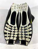 Boots are the most obviously distinctive family of nordic ski boots. They have a 75mm wide "duck bill" at the front of the boot, with three holes on the bottom of the bill that line up with the pins on their appropriate binding.