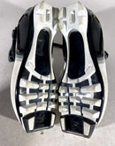 Boots are the most obviously distinctive family of nordic ski boots. They have a 75mm wide "duck bill" at the front of the boot, with three holes on the bottom of the bill that line up with the pins on their appropriate binding.