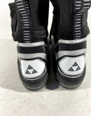 Boots are the most obviously distinctive family of nordic ski boots. They have a 75mm wide "duck bill" at the front of the boot, with three holes on the bottom of the bill that line up with the pins on their appropriate binding.