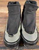 Boots are the most obviously distinctive family of nordic ski boots. They have a 75mm wide "duck bill" at the front of the boot, with three holes on the bottom of the bill that line up with the pins on their appropriate binding.