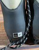Boots are the most obviously distinctive family of nordic ski boots. They have a 75mm wide "duck bill" at the front of the boot, with three holes on the bottom of the bill that line up with the pins on their appropriate binding.