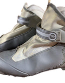 Boots are the most obviously distinctive family of nordic ski boots. They have a 75mm wide "duck bill" at the front of the boot, with three holes on the bottom of the bill that line up with the pins on their appropriate binding.
