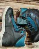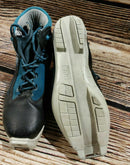 Boots are the most obviously distinctive family of nordic ski boots. They have a 75mm wide "duck bill" at the front of the boot, with three holes on the bottom of the bill that line up with the pins on their appropriate binding.